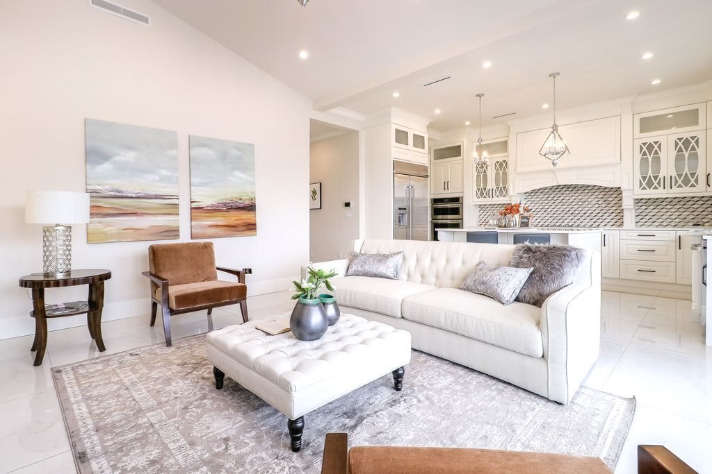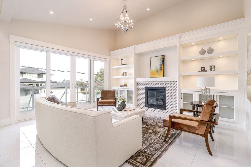 - Grand Living Room designed with a custom-built fireplace wall, integrated shelving, and large windows for natural light