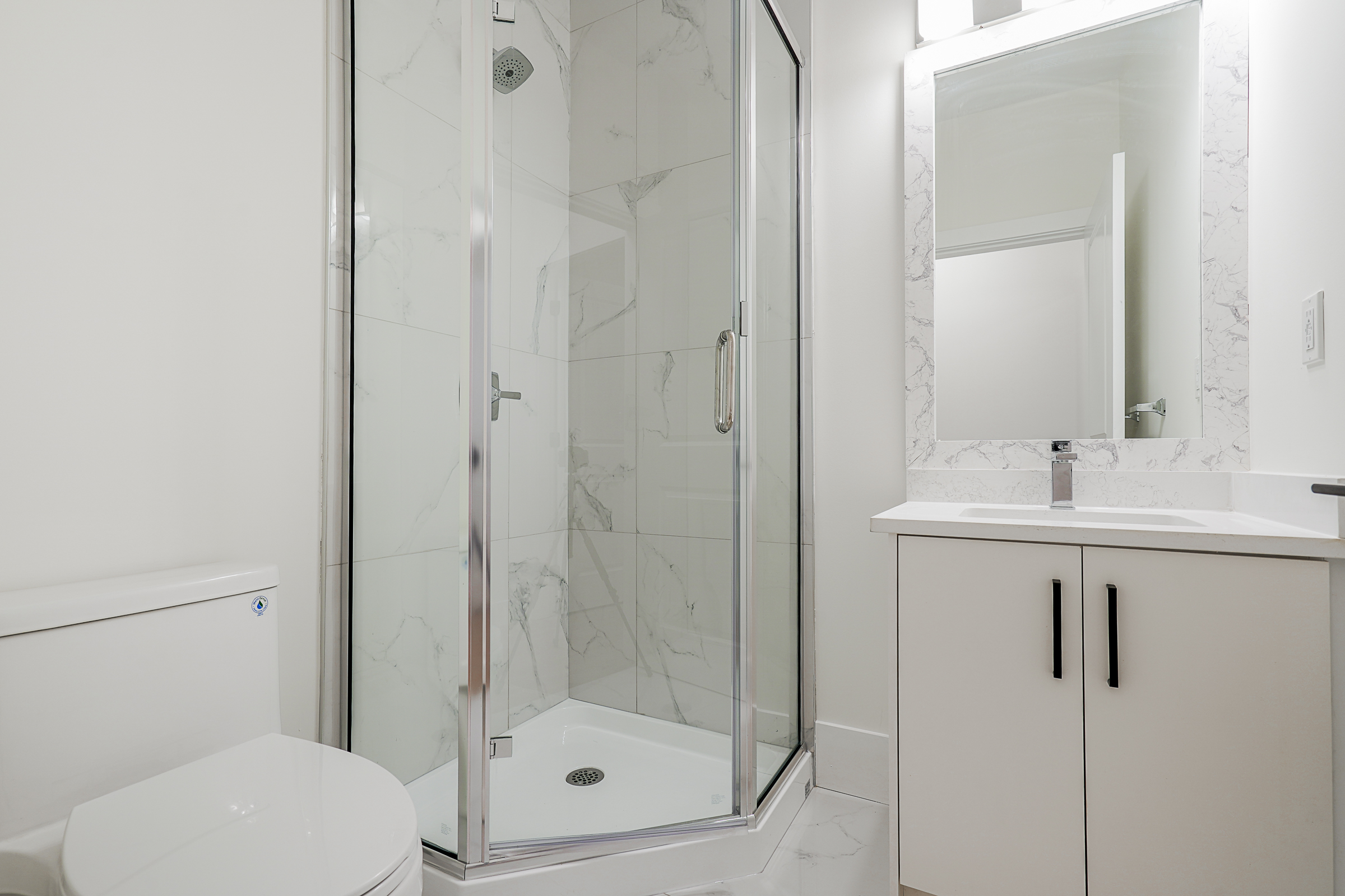 - Luxury Bathrooms with floor-to-ceiling marble-style tiles, glass-enclosed showers, and modern vanities